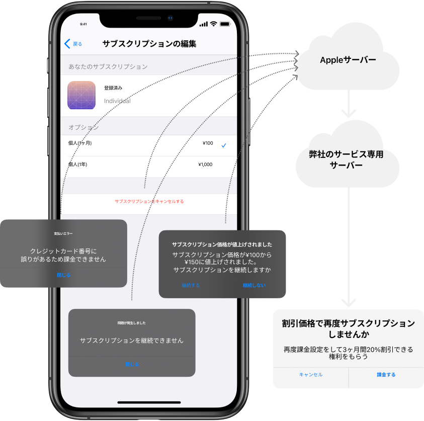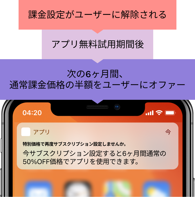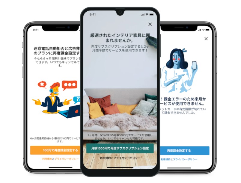有料課金ユーザーを維持するために、 ユーザーの解約理由に応じて、 最適な割引や特典などのインセンティブを提供します。 あらかじめオファーの内容を設定しておけば、 自動的にオファーが送信されます。 当社の長年培ったアルゴリズムを活用し、 データを基にした効果的な様々なパターンの割引オファーをご提案します。